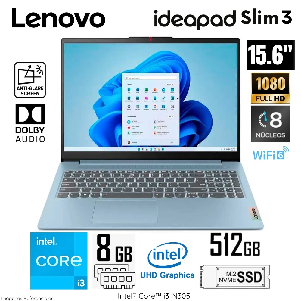 Notebook Lenovo IdeaPad Slim 3 con procesador Intel Core i3-N305 de última generación, pantalla Full HD de 15.6”, 8GB de RAM LPDDR5 y diseño ultradelgado. Ideal para uso diario, estudiantes y tareas de oficina.
