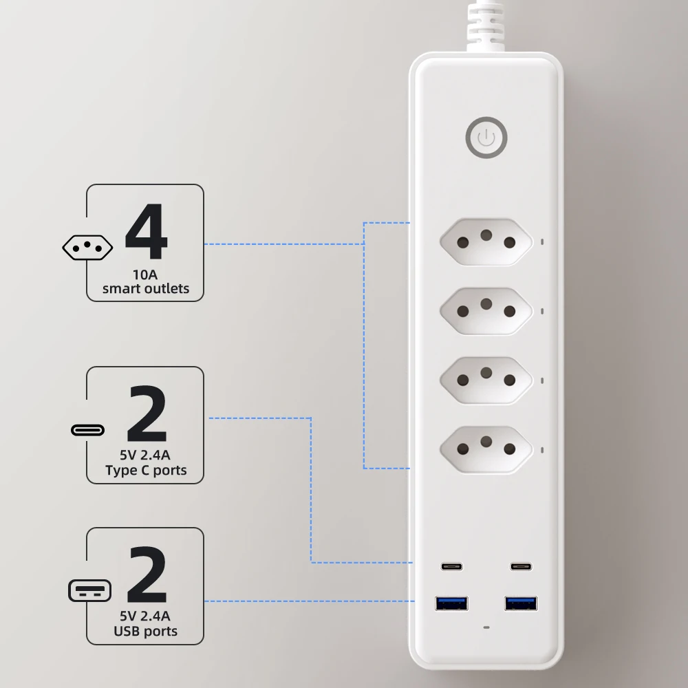 Tomacorriente Inteligente WiFi – 4 Tomas, 2 USB + 2 USB Tipo C, Compatible con Alexa y Google Home